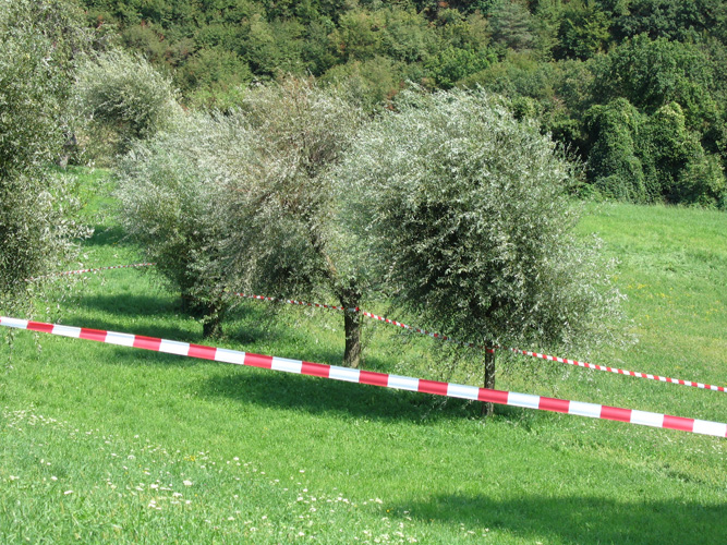 © Renate Egger. Paradies/Paradise/Paradiso, 2006. Installation, Land art. Absperrband, Weidenbäume/Barrier tape, willow-trees. Sentieri nell`Arte. Caprino Veronese, Garda, Italy
