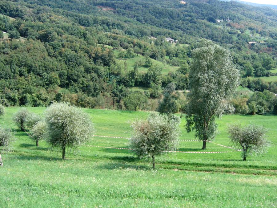 © Renate Egger. Paradies/Paradise/Paradiso, 2006. Installation, Land art. Absperrband, Weidenbäume/Barrier tape, willow-trees. Sentieri nell`Arte. Baldo Festival. Caprino Veronese, Garda, Italy
