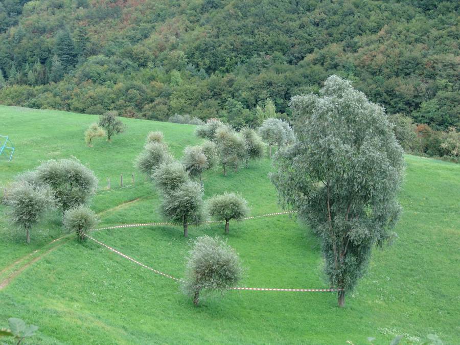 © Renate Egger. Paradies/Paradise/Paradiso, 2006. Installation, Land art. Absperrband, Weidenbäume/Barrier tape, willow-trees. Sentieri nell`Arte. Baldo Festival. Caprino Veronese, Garda, Italy